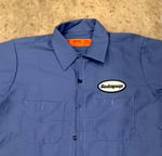 Custom-made hand-sewn patch on a new workwear gas station attendant's short-sleeve shirt.